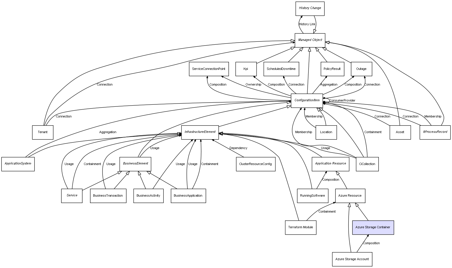 | Azure Storage Account | Azure Storage Container | Composition | Represents a relation between 2 objects where one is contained within the other, and the included object can not exist without its container. Therefore, when the container is deleted, all its contained object will be automatically removed |