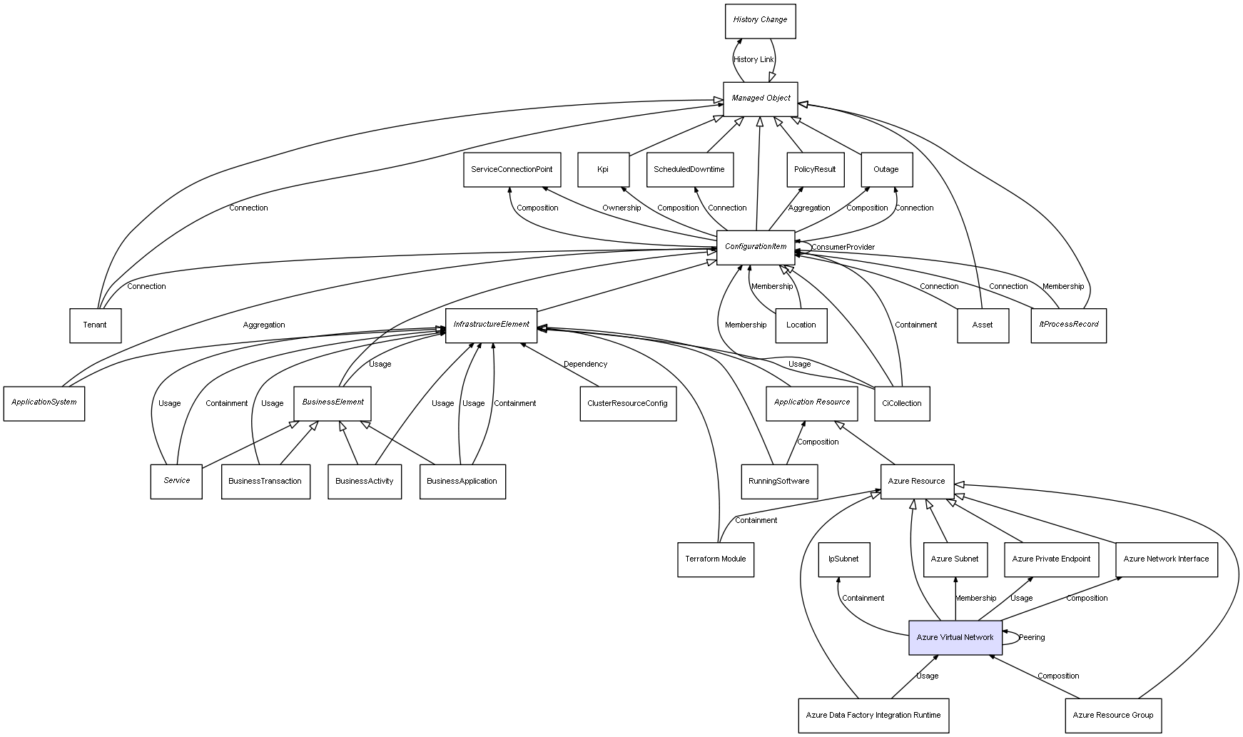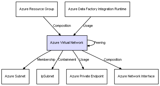 | Azure Resource Group | Azure Virtual Network | Composition | Represents a relation between 2 objects where one is contained within the other, and the included object can not exist without its container. Therefore, when the container is deleted, all its contained object will be automatically removed |