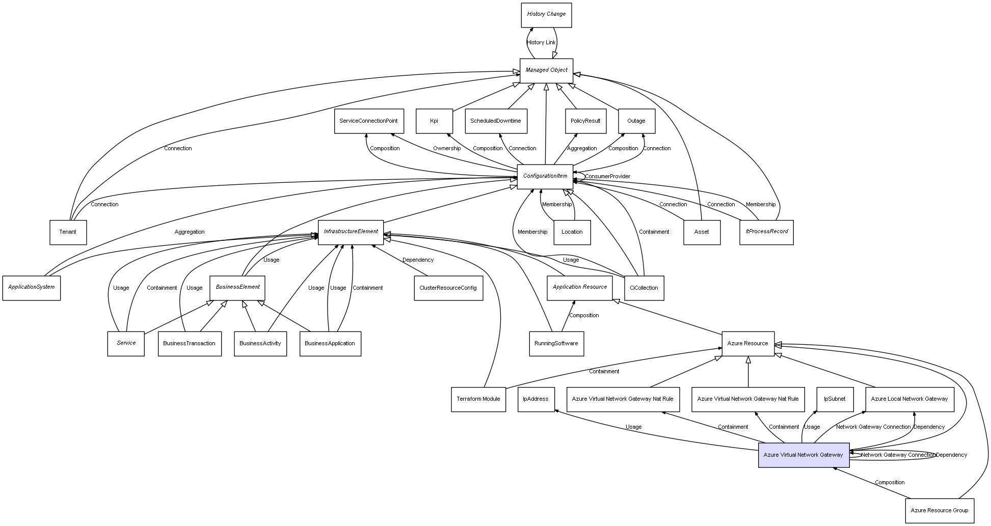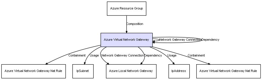 | Azure Resource Group | Azure Virtual Network Gateway | Composition | Represents a relation between 2 objects where one is contained within the other, and the included object can not exist without its container. Therefore, when the container is deleted, all its contained object will be automatically removed |