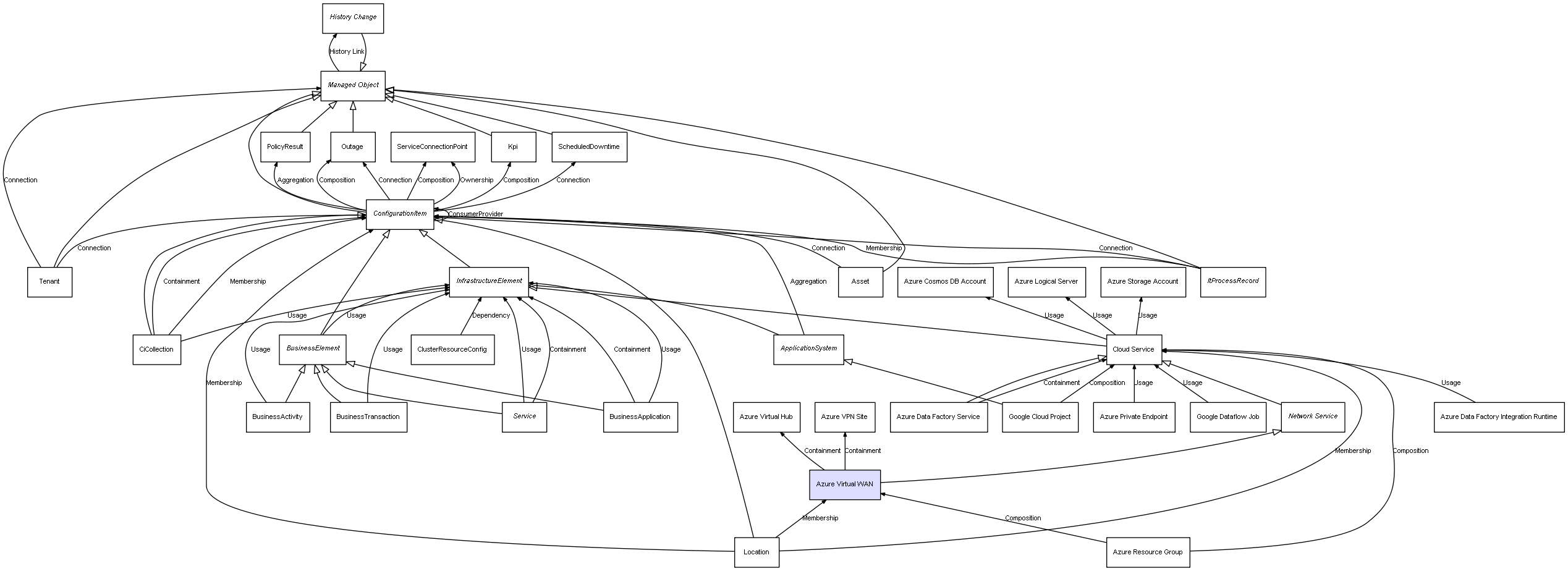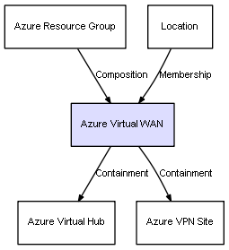 | Azure Resource Group | Azure Virtual WAN | Composition | Represents a relation between 2 objects where one is contained within the other, and the included object can not exist without its container. Therefore, when the container is deleted, all its contained object will be automatically removed |