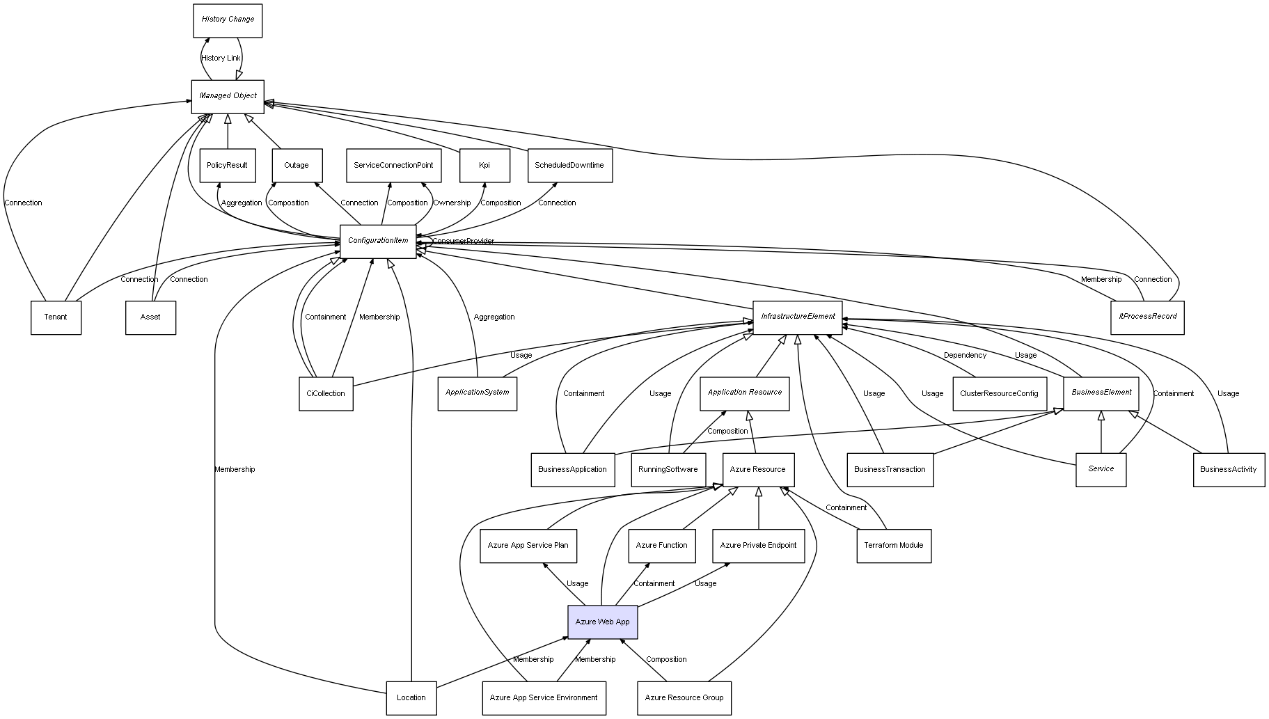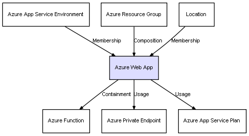 | Azure Resource Group | Azure Web App | Composition | Represents a relation between 2 objects where one is contained within the other, and the included object can not exist without its container. Therefore, when the container is deleted, all its contained object will be automatically removed |