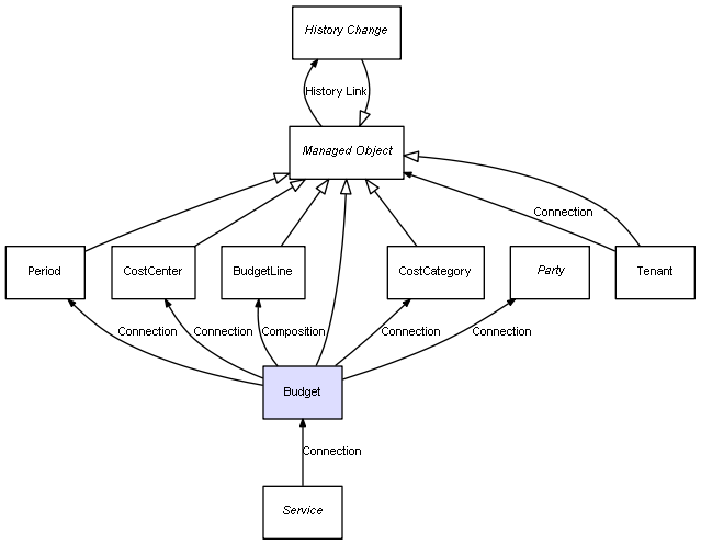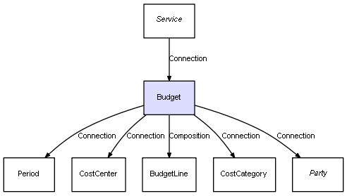 | Budget | BudgetLine | Composition | Represents a relation between 2 objects where one is contained within the other, and the included object can not exist without its container. Therefore, when the container is deleted, all its contained object will be automatically removed |