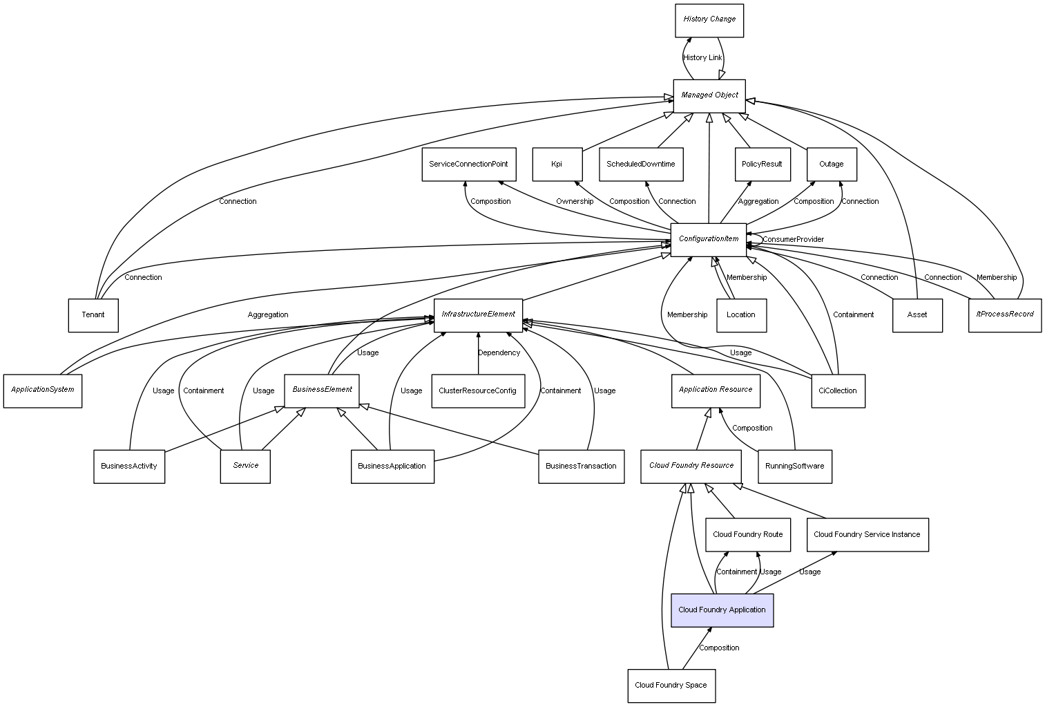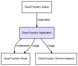 | Cloud Foundry Space | Cloud Foundry Application | Composition | Represents a relation between 2 objects where one is contained within the other, and the included object can not exist without its container. Therefore, when the container is deleted, all its contained object will be automatically removed |