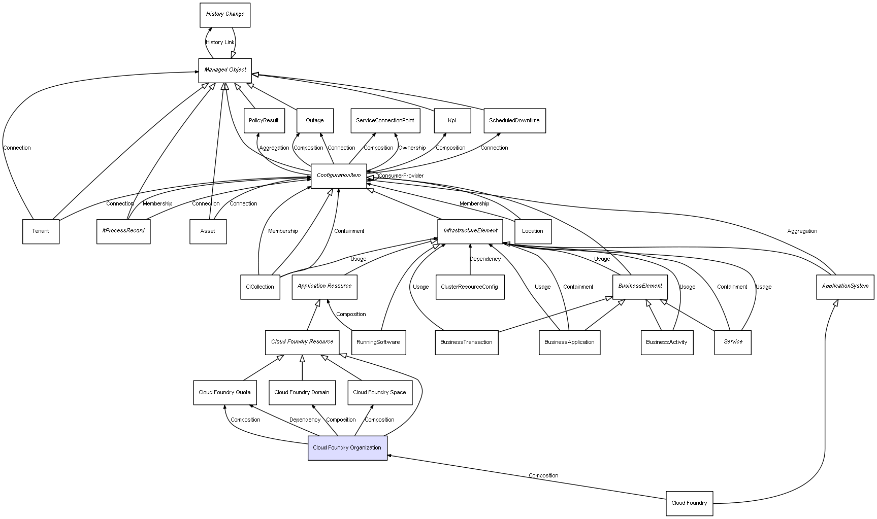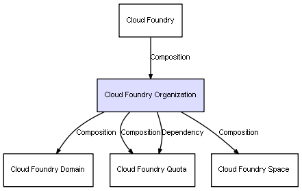 | Cloud Foundry | Cloud Foundry Organization | Composition | Represents a relation between 2 objects where one is contained within the other, and the included object can not exist without its container. Therefore, when the container is deleted, all its contained object will be automatically removed |