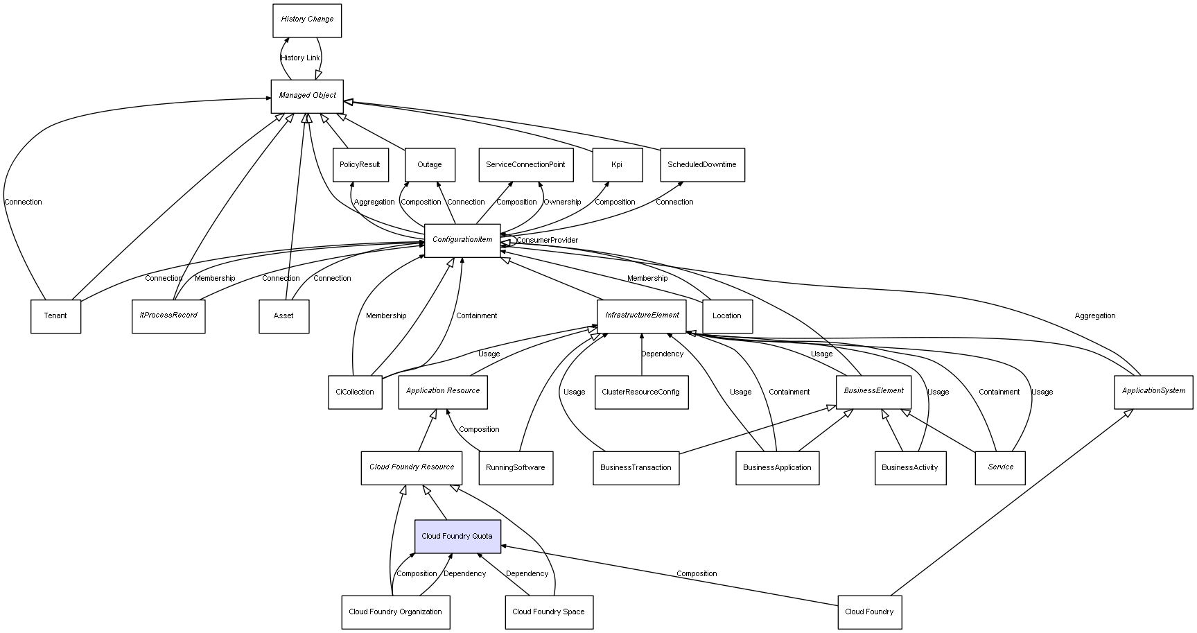 | Cloud Foundry Organization | Cloud Foundry Quota | Composition | Represents a relation between 2 objects where one is contained within the other, and the included object can not exist without its container. Therefore, when the container is deleted, all its contained object will be automatically removed |