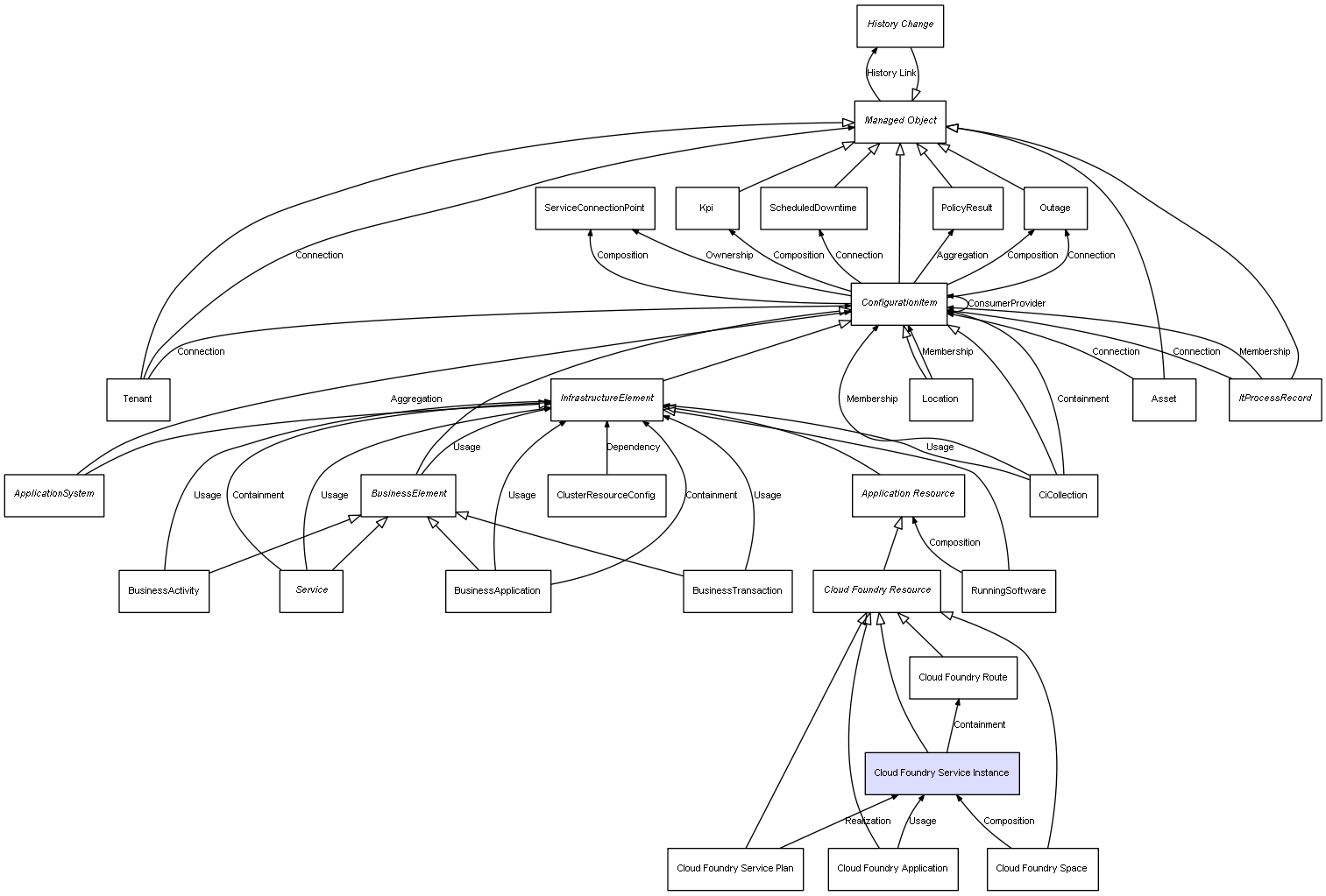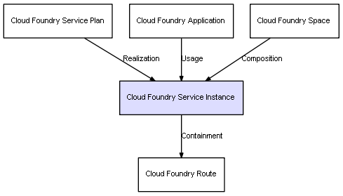 | Cloud Foundry Space | Cloud Foundry Service Instance | Composition | Represents a relation between 2 objects where one is contained within the other, and the included object can not exist without its container. Therefore, when the container is deleted, all its contained object will be automatically removed |
