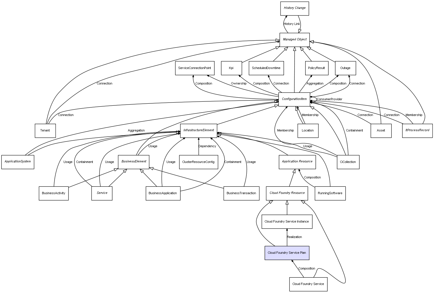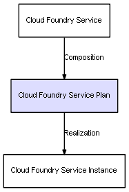 | Cloud Foundry Service | Cloud Foundry Service Plan | Composition | Represents a relation between 2 objects where one is contained within the other, and the included object can not exist without its container. Therefore, when the container is deleted, all its contained object will be automatically removed |