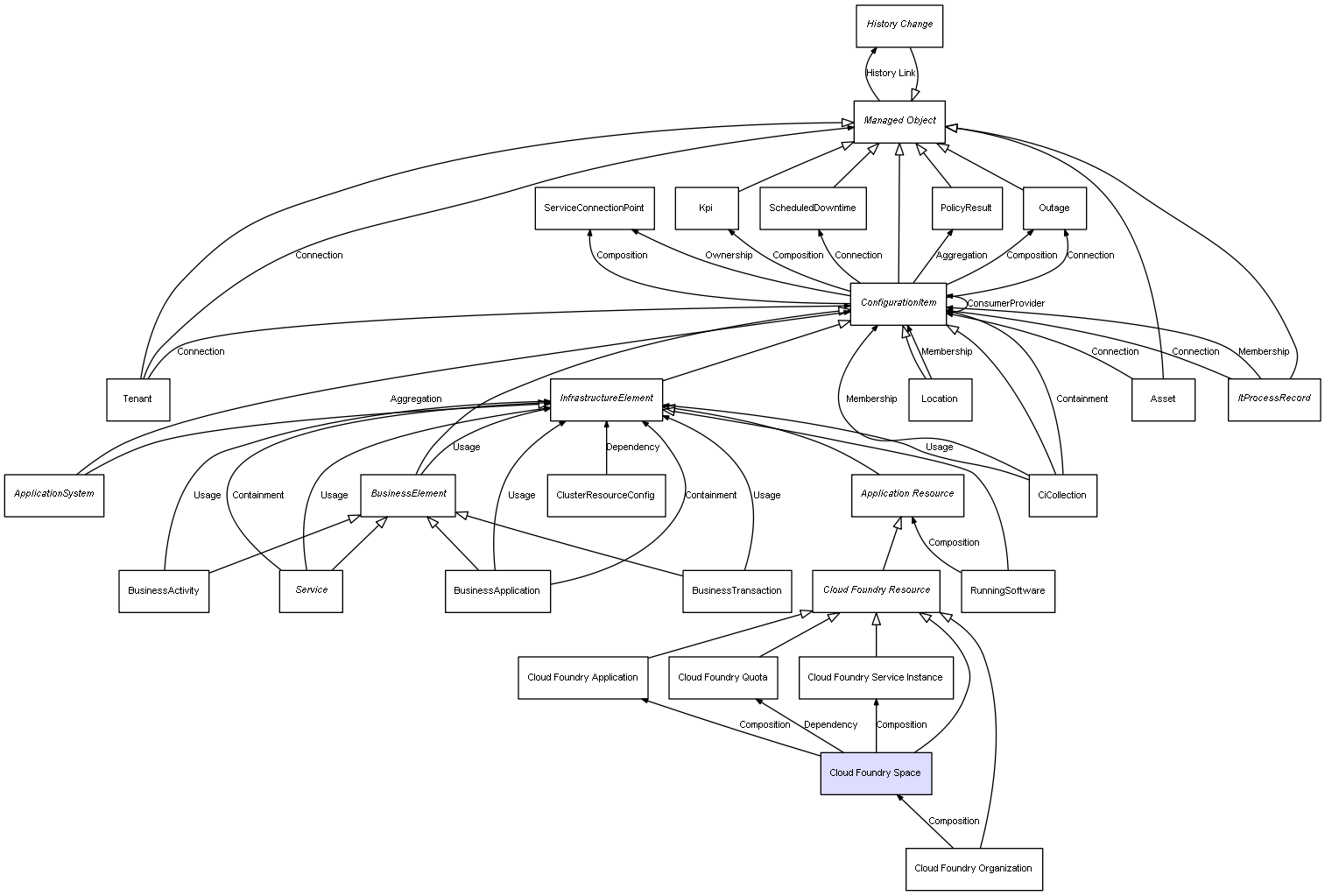 | Cloud Foundry Organization | Cloud Foundry Space | Composition | Represents a relation between 2 objects where one is contained within the other, and the included object can not exist without its container. Therefore, when the container is deleted, all its contained object will be automatically removed |