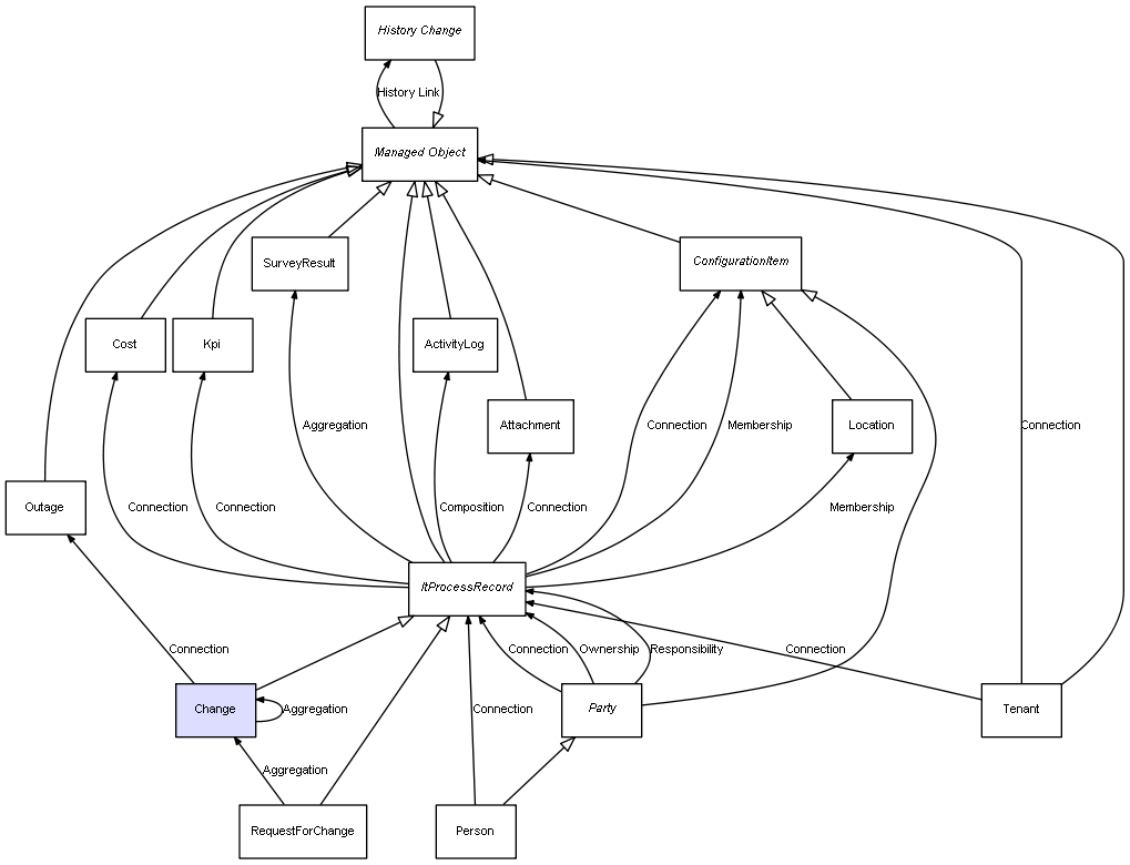 | Description | A Record containing the details of a Change. Each Change Record documents the Lifecycle of a single Change. A Change Record is created for every Request for Change that is received, even those that are subsequently rejected. Change Records should reference the Configuration Items that are affected by the Change. Change Records are stored in the Configuration Management System. This class corresponds to what ITILv3 calls a Change Record. |