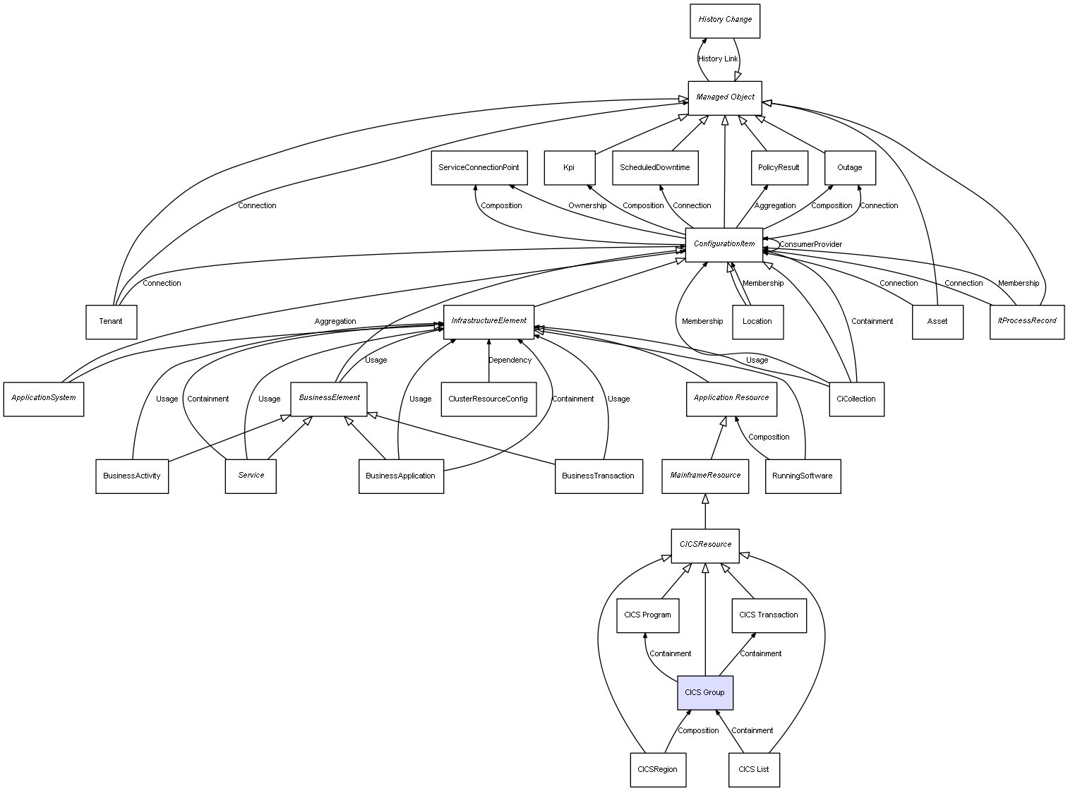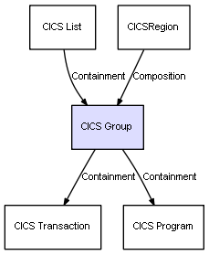 | CICSRegion | CICS Group | Composition | Represents a relation between 2 objects where one is contained within the other, and the included object can not exist without its container. Therefore, when the container is deleted, all its contained object will be automatically removed |