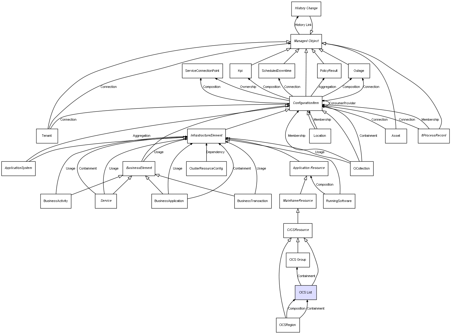 | CICSRegion | CICS List | Composition | Represents a relation between 2 objects where one is contained within the other, and the included object can not exist without its container. Therefore, when the container is deleted, all its contained object will be automatically removed |