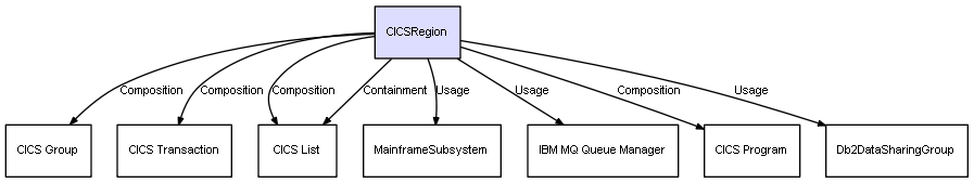 | CICSRegion | CICS Transaction | Composition | Represents a relation between 2 objects where one is contained within the other, and the included object can not exist without its container. Therefore, when the container is deleted, all its contained object will be automatically removed |