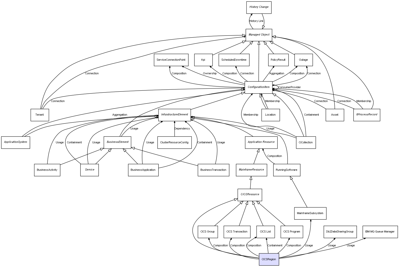 | CICSRegion | CICS Group | Composition | Represents a relation between 2 objects where one is contained within the other, and the included object can not exist without its container. Therefore, when the container is deleted, all its contained object will be automatically removed |
