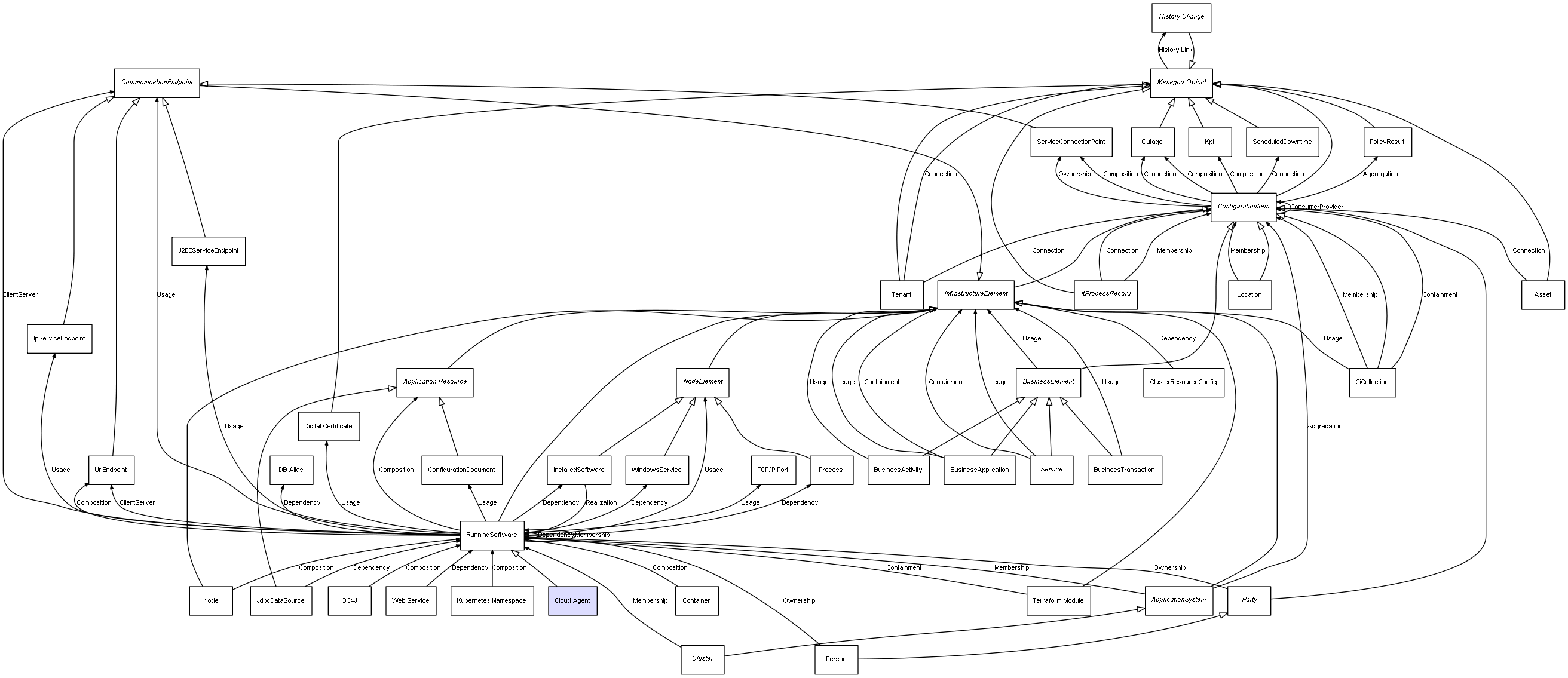 | ConfigurationItem | ServiceConnectionPoint | Composition | Represents a relation between 2 objects where one is contained within the other, and the included object can not exist without its container. Therefore, when the container is deleted, all its contained object will be automatically removed |
