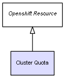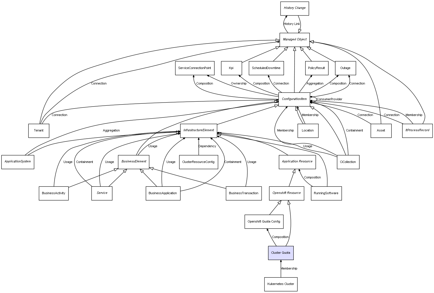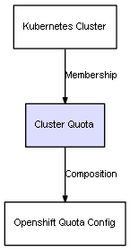 | Cluster Quota | Openshift Quota Config | Composition | Represents a relation between 2 objects where one is contained within the other, and the included object can not exist without its container. Therefore, when the container is deleted, all its contained object will be automatically removed |