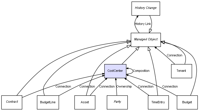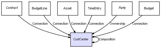 | CostCenter | CostCenter | Composition | Represents a relation between 2 objects where one is contained within the other, and the included object can not exist without its container. Therefore, when the container is deleted, all its contained object will be automatically removed |