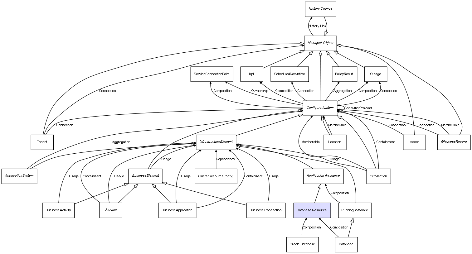 | Oracle Database | Database Resource | Composition | Represents a relation between 2 objects where one is contained within the other, and the included object can not exist without its container. Therefore, when the container is deleted, all its contained object will be automatically removed |