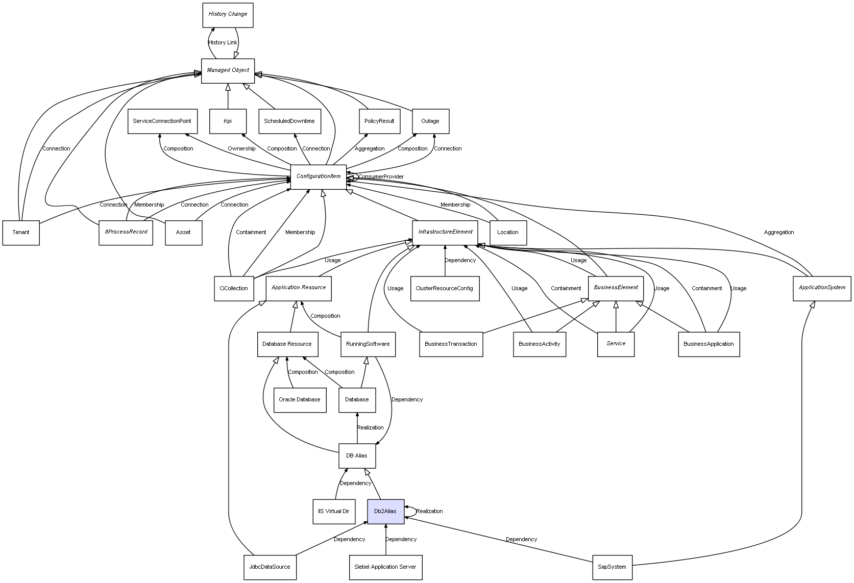 | ConfigurationItem | ServiceConnectionPoint | Composition | Represents a relation between 2 objects where one is contained within the other, and the included object can not exist without its container. Therefore, when the container is deleted, all its contained object will be automatically removed |
