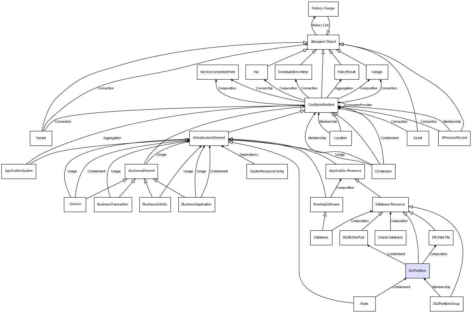 | ConfigurationItem | ServiceConnectionPoint | Composition | Represents a relation between 2 objects where one is contained within the other, and the included object can not exist without its container. Therefore, when the container is deleted, all its contained object will be automatically removed |