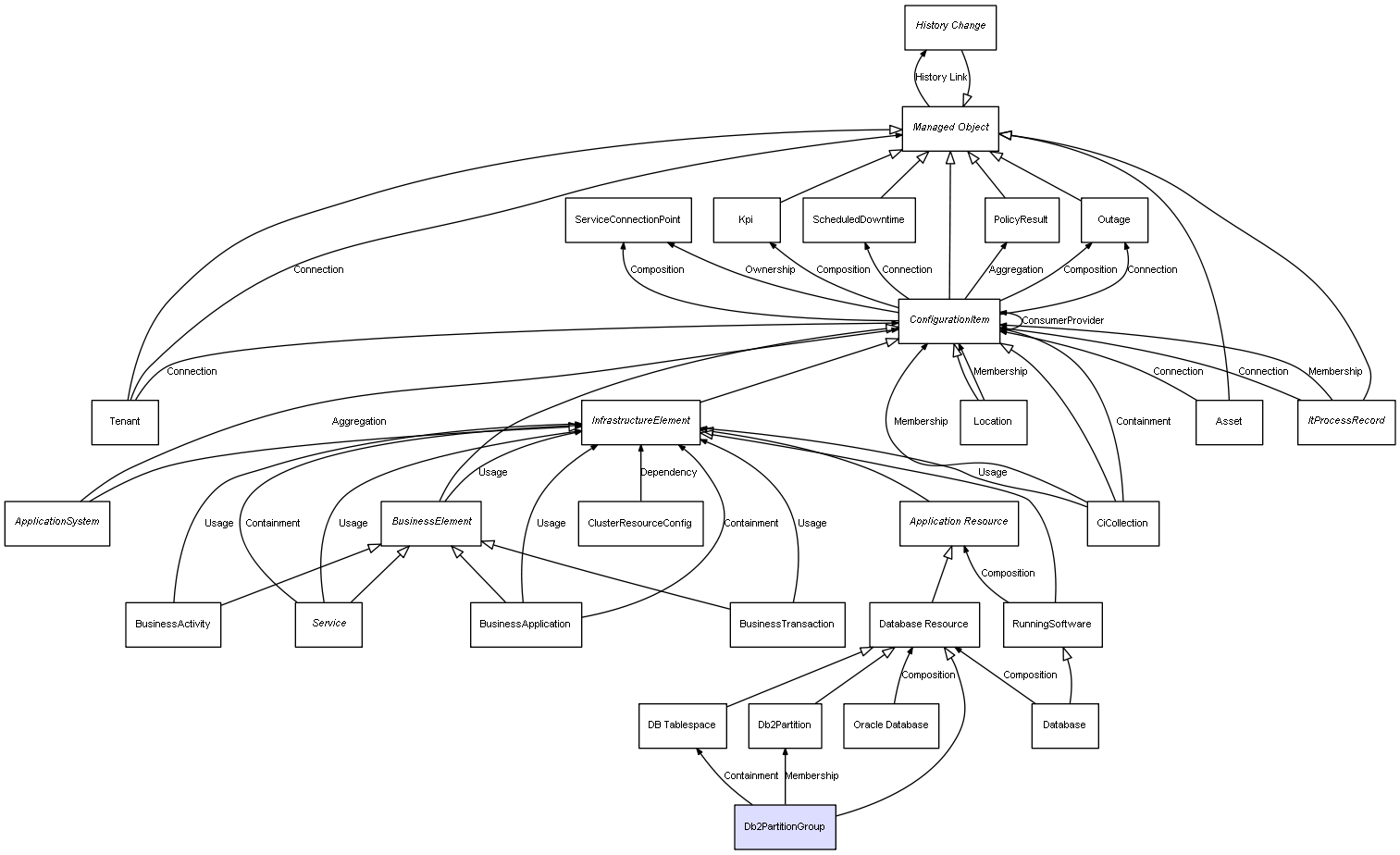 | ConfigurationItem | Outage | Composition | Represents a relation between 2 objects where one is contained within the other, and the included object can not exist without its container. Therefore, when the container is deleted, all its contained object will be automatically removed |