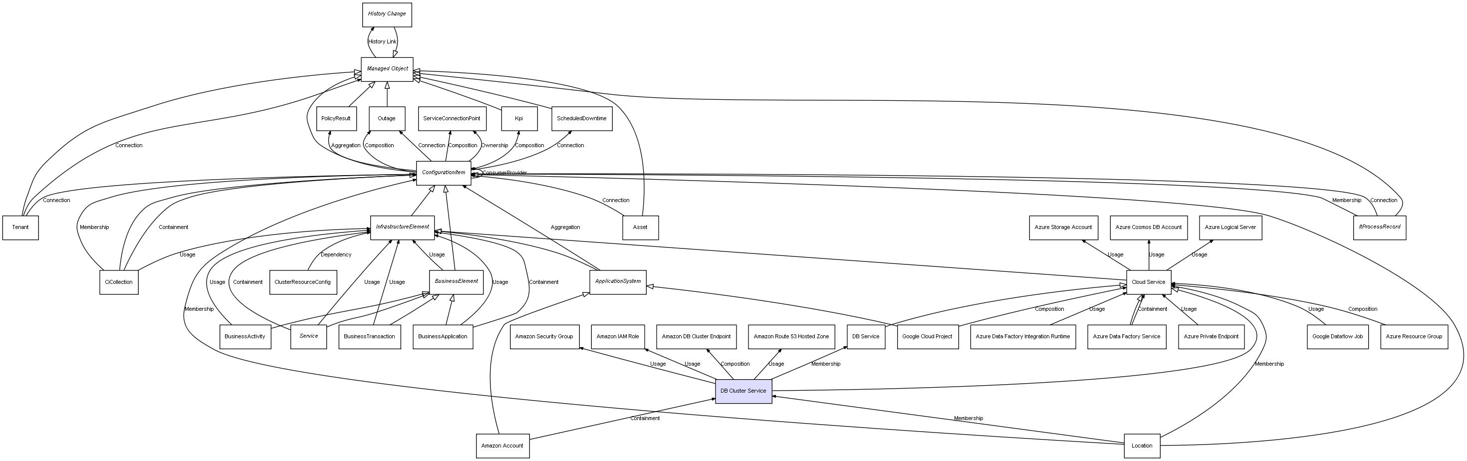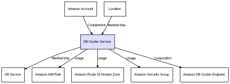 | DB Cluster Service | Amazon DB Cluster Endpoint | Composition | Represents a relation between 2 objects where one is contained within the other, and the included object can not exist without its container. Therefore, when the container is deleted, all its contained object will be automatically removed |