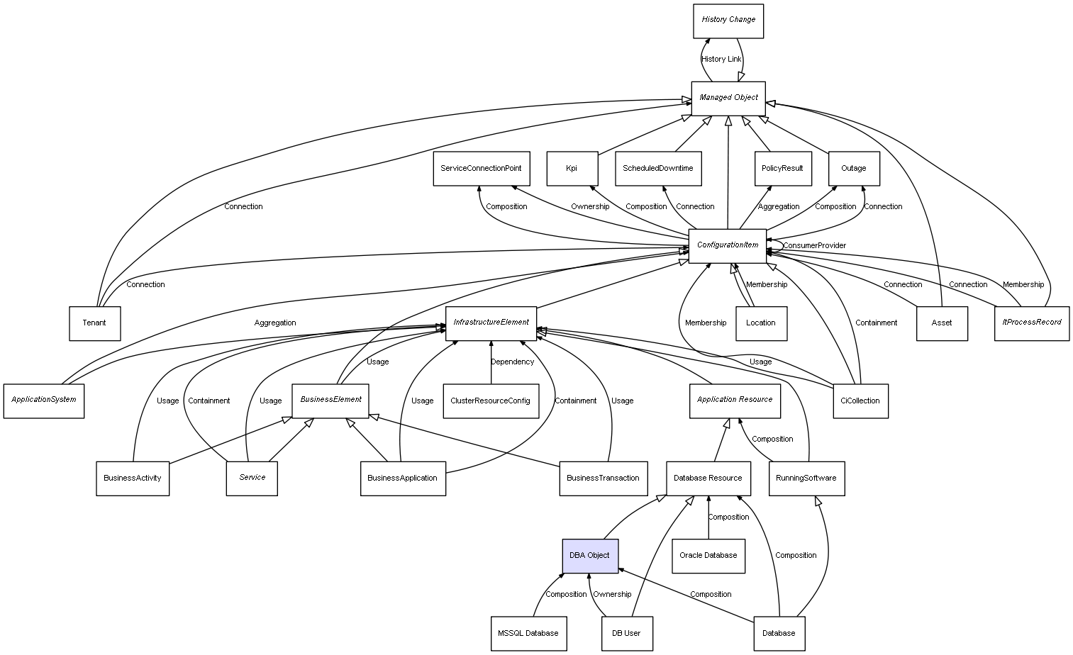 | ConfigurationItem | Outage | Composition | Represents a relation between 2 objects where one is contained within the other, and the included object can not exist without its container. Therefore, when the container is deleted, all its contained object will be automatically removed |