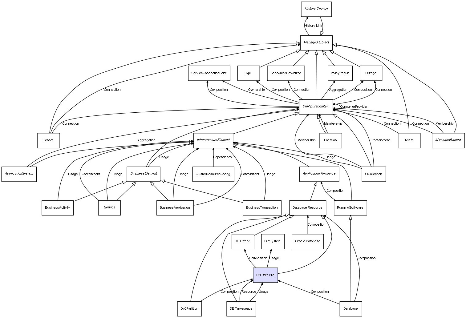 | Database | DB Data File | Composition | Represents a relation between 2 objects where one is contained within the other, and the included object can not exist without its container. Therefore, when the container is deleted, all its contained object will be automatically removed |