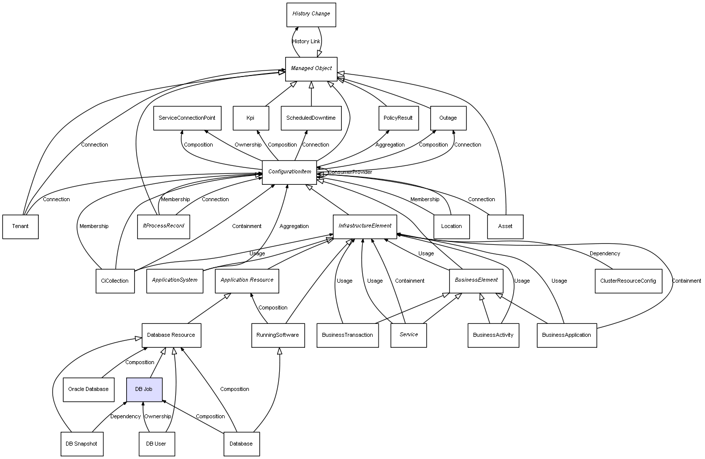 | ConfigurationItem | ServiceConnectionPoint | Composition | Represents a relation between 2 objects where one is contained within the other, and the included object can not exist without its container. Therefore, when the container is deleted, all its contained object will be automatically removed |