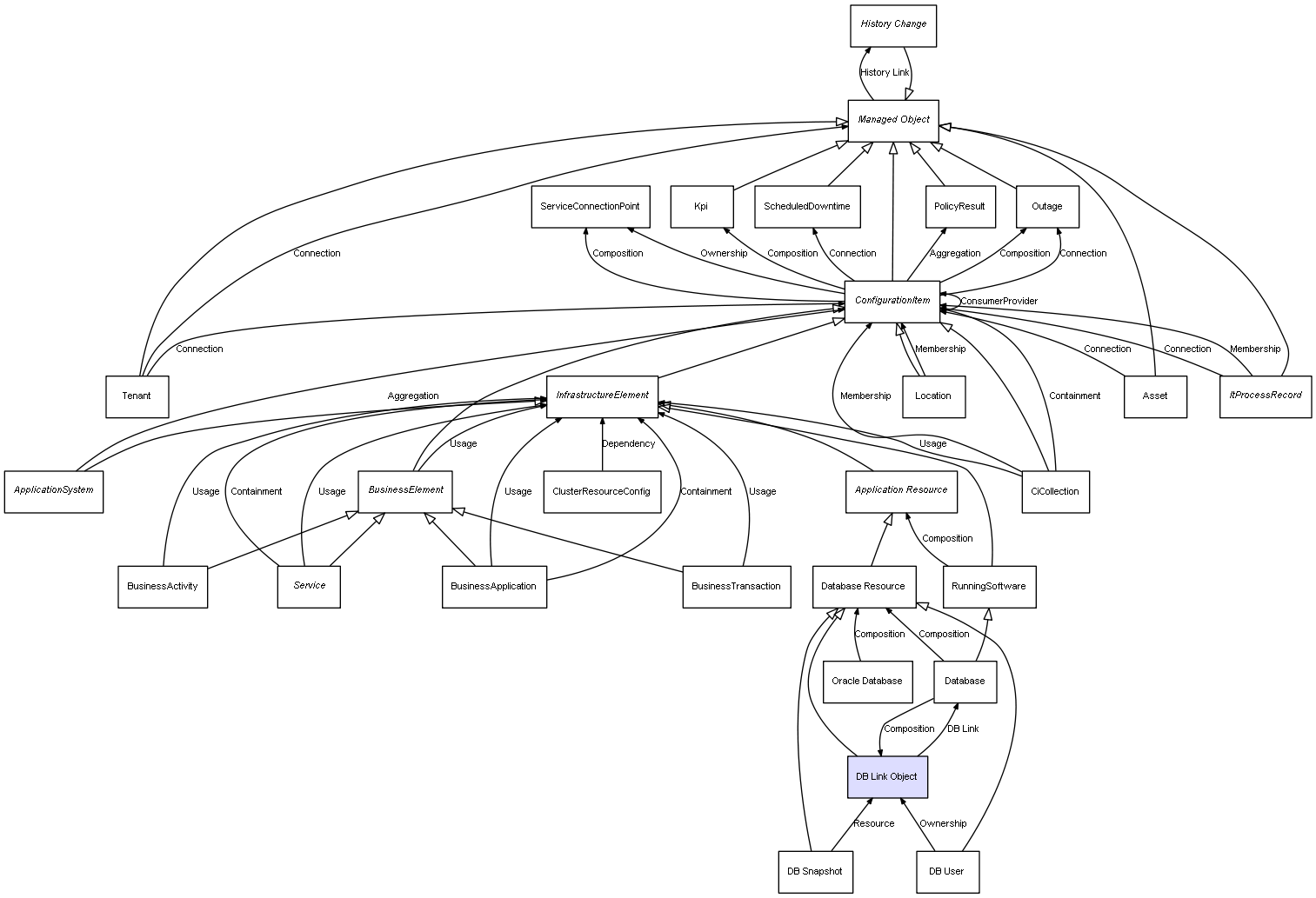 | Oracle Database | Database Resource | Composition | Represents a relation between 2 objects where one is contained within the other, and the included object can not exist without its container. Therefore, when the container is deleted, all its contained object will be automatically removed |