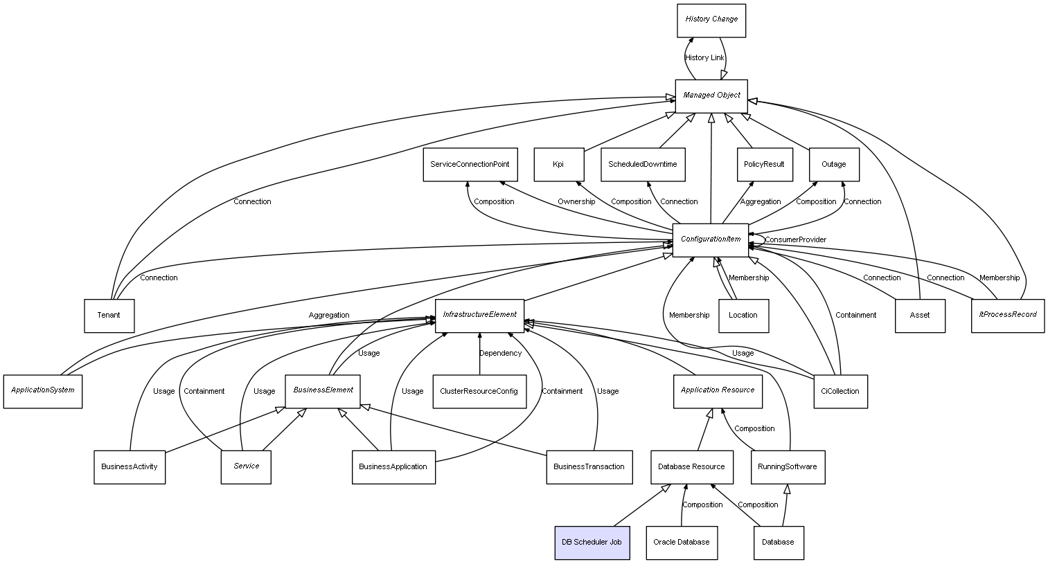 | ConfigurationItem | Outage | Composition | Represents a relation between 2 objects where one is contained within the other, and the included object can not exist without its container. Therefore, when the container is deleted, all its contained object will be automatically removed |