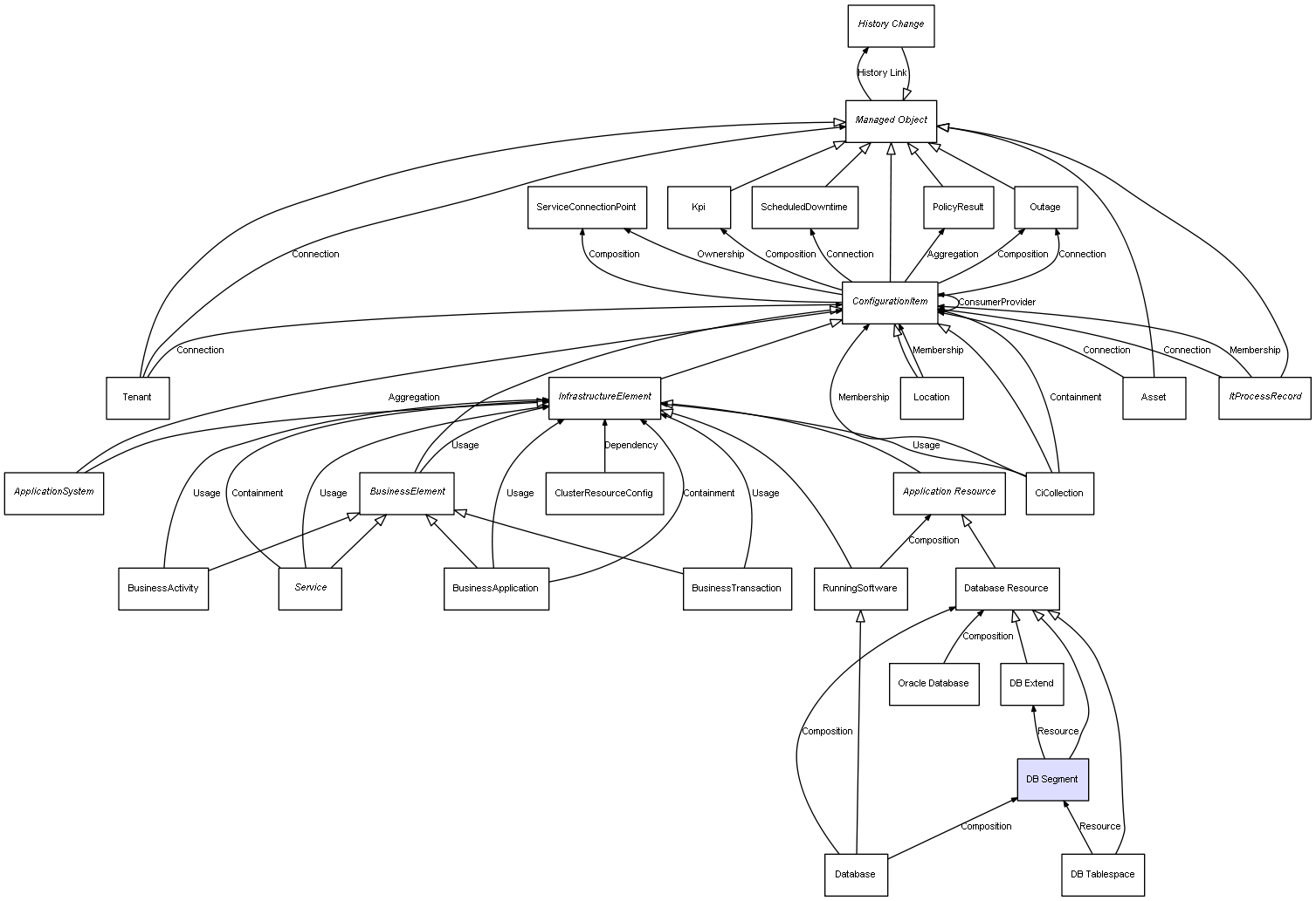 | Database | DB Segment | Composition | Represents a relation between 2 objects where one is contained within the other, and the included object can not exist without its container. Therefore, when the container is deleted, all its contained object will be automatically removed |