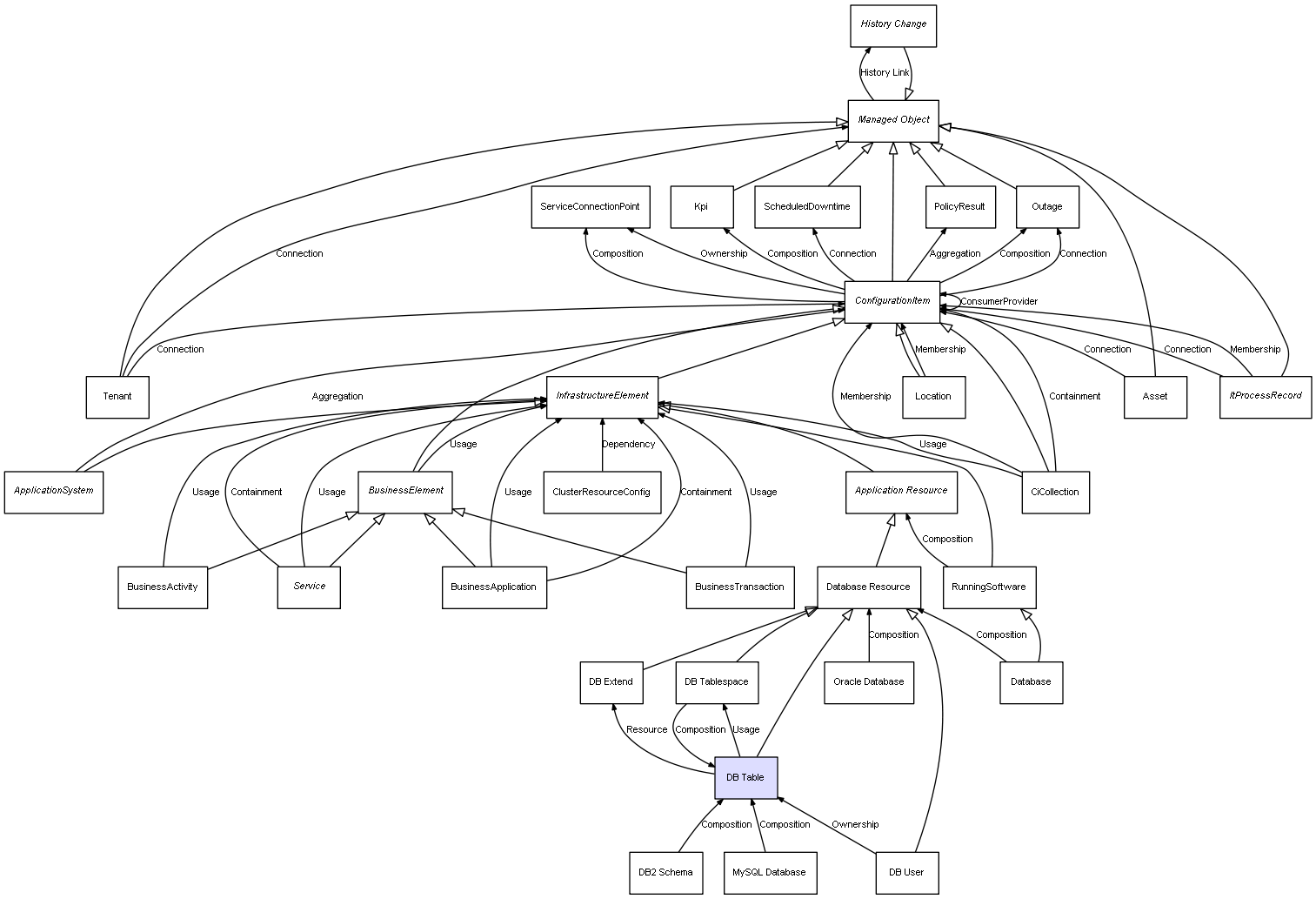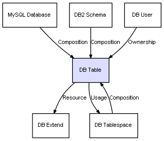 | DB Tablespace | DB Table | Composition | Represents a relation between 2 objects where one is contained within the other, and the included object can not exist without its container. Therefore, when the container is deleted, all its contained object will be automatically removed |