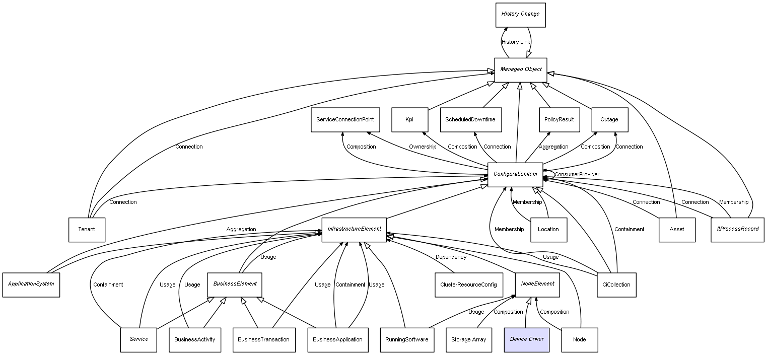 | ConfigurationItem | Outage | Composition | Represents a relation between 2 objects where one is contained within the other, and the included object can not exist without its container. Therefore, when the container is deleted, all its contained object will be automatically removed |