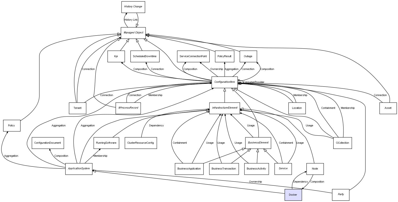 | ConfigurationItem | Outage | Composition | Represents a relation between 2 objects where one is contained within the other, and the included object can not exist without its container. Therefore, when the container is deleted, all its contained object will be automatically removed |