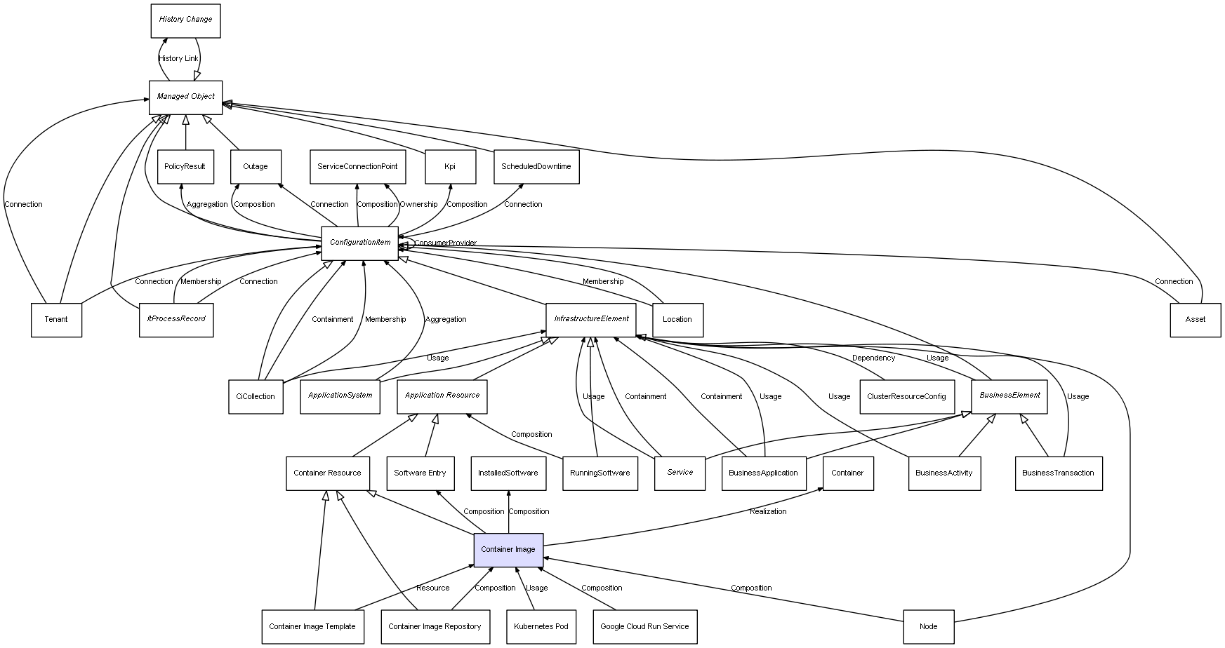 | Container Image | Software Entry | Composition | Represents a relation between 2 objects where one is contained within the other, and the included object can not exist without its container. Therefore, when the container is deleted, all its contained object will be automatically removed |