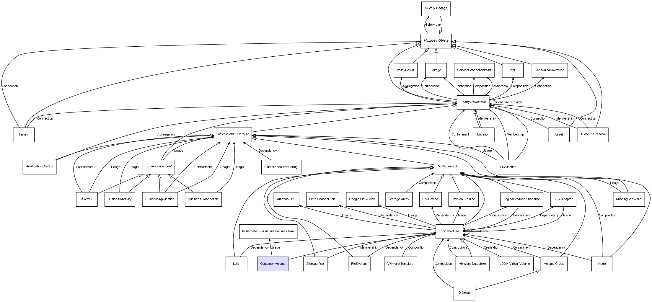 | VMware Template | LogicalVolume | Composition | Represents a relation between 2 objects where one is contained within the other, and the included object can not exist without its container. Therefore, when the container is deleted, all its contained object will be automatically removed |