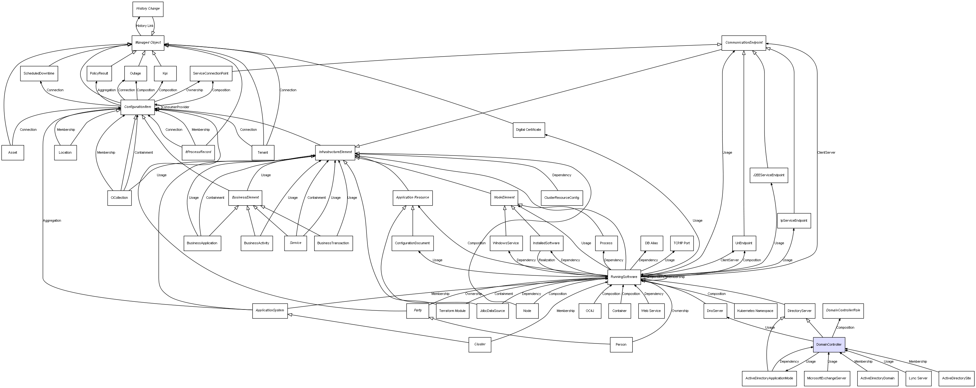 | ConfigurationItem | ServiceConnectionPoint | Composition | Represents a relation between 2 objects where one is contained within the other, and the included object can not exist without its container. Therefore, when the container is deleted, all its contained object will be automatically removed |