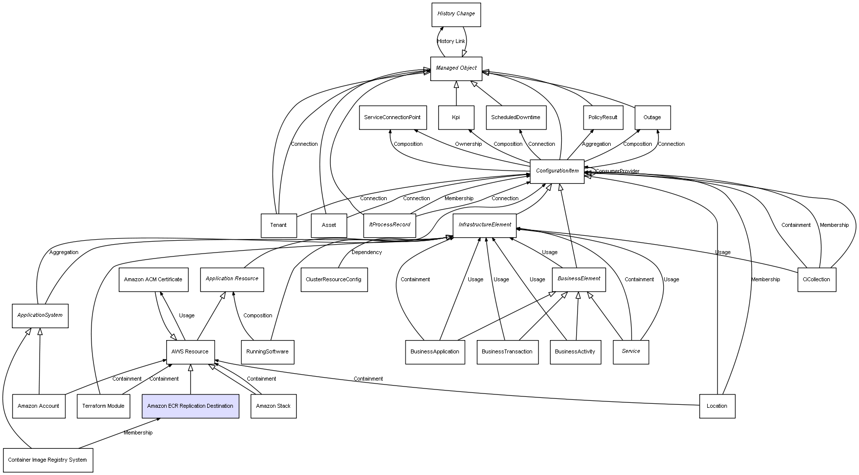 | ConfigurationItem | ServiceConnectionPoint | Composition | Represents a relation between 2 objects where one is contained within the other, and the included object can not exist without its container. Therefore, when the container is deleted, all its contained object will be automatically removed |