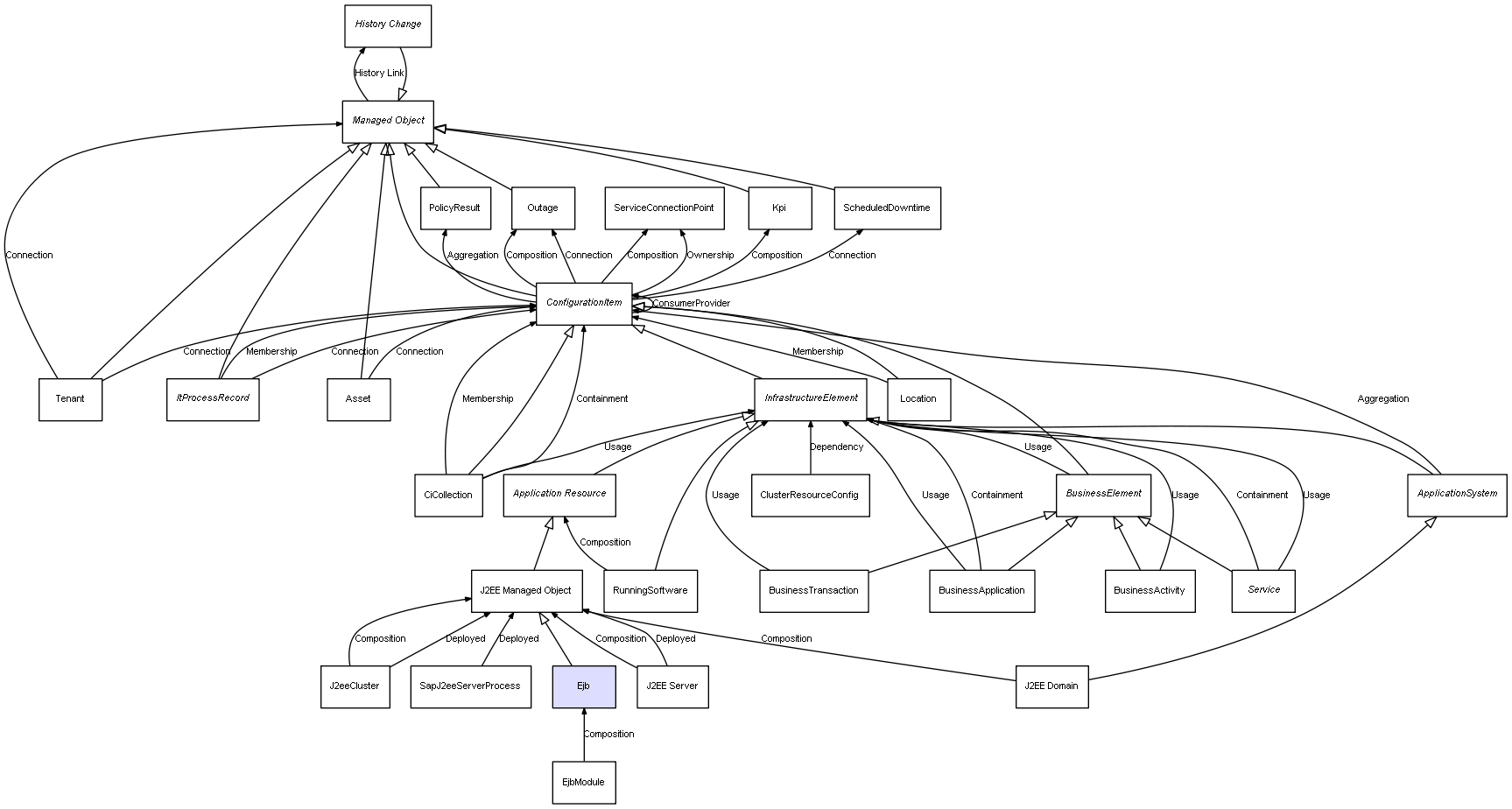 | J2EE Server | J2EE Managed Object | Composition | Represents a relation between 2 objects where one is contained within the other, and the included object can not exist without its container. Therefore, when the container is deleted, all its contained object will be automatically removed |