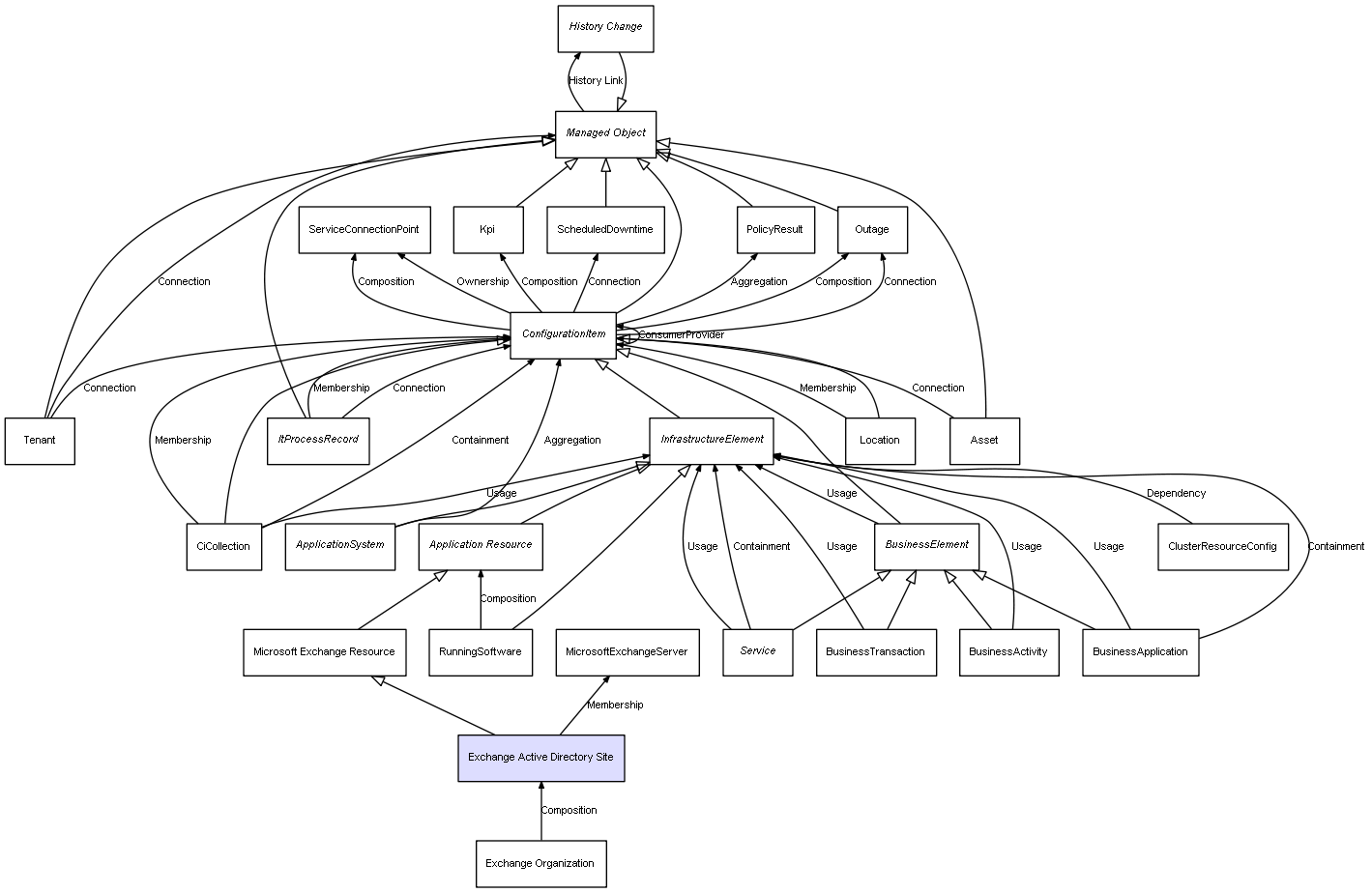 | Exchange Organization | Exchange Active Directory Site | Composition | Represents a relation between 2 objects where one is contained within the other, and the included object can not exist without its container. Therefore, when the container is deleted, all its contained object will be automatically removed |