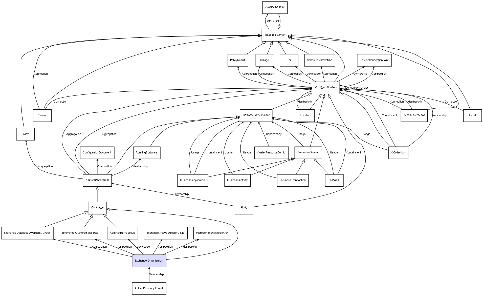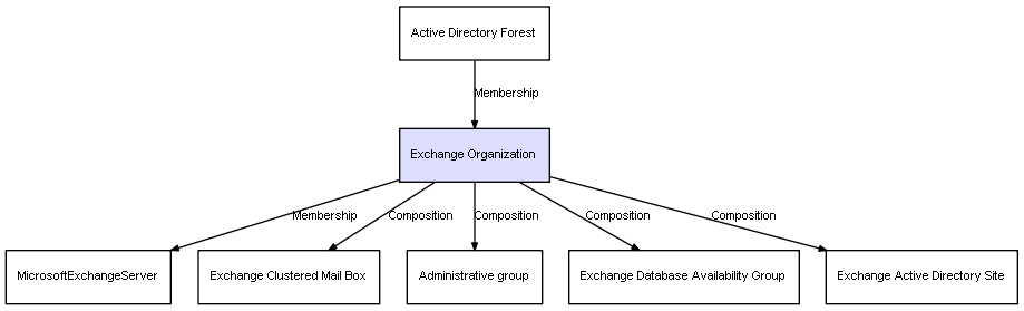 | Exchange Organization | Exchange Active Directory Site | Composition | Represents a relation between 2 objects where one is contained within the other, and the included object can not exist without its container. Therefore, when the container is deleted, all its contained object will be automatically removed |