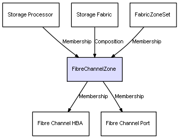 | Storage Fabric | FibreChannelZone | Composition | Represents a relation between 2 objects where one is contained within the other, and the included object can not exist without its container. Therefore, when the container is deleted, all its contained object will be automatically removed |