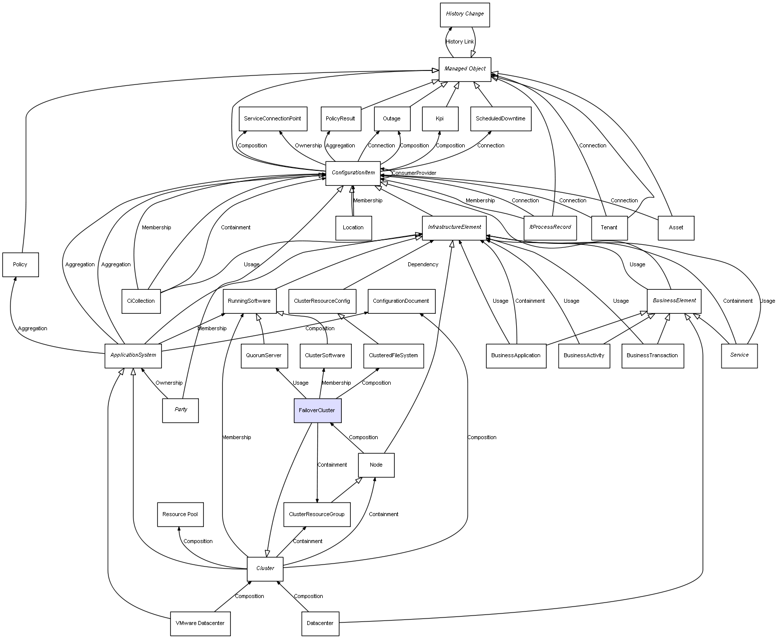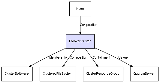 | Node | FailoverCluster | Composition | Represents a relation between 2 objects where one is contained within the other, and the included object can not exist without its container. Therefore, when the container is deleted, all its contained object will be automatically removed |