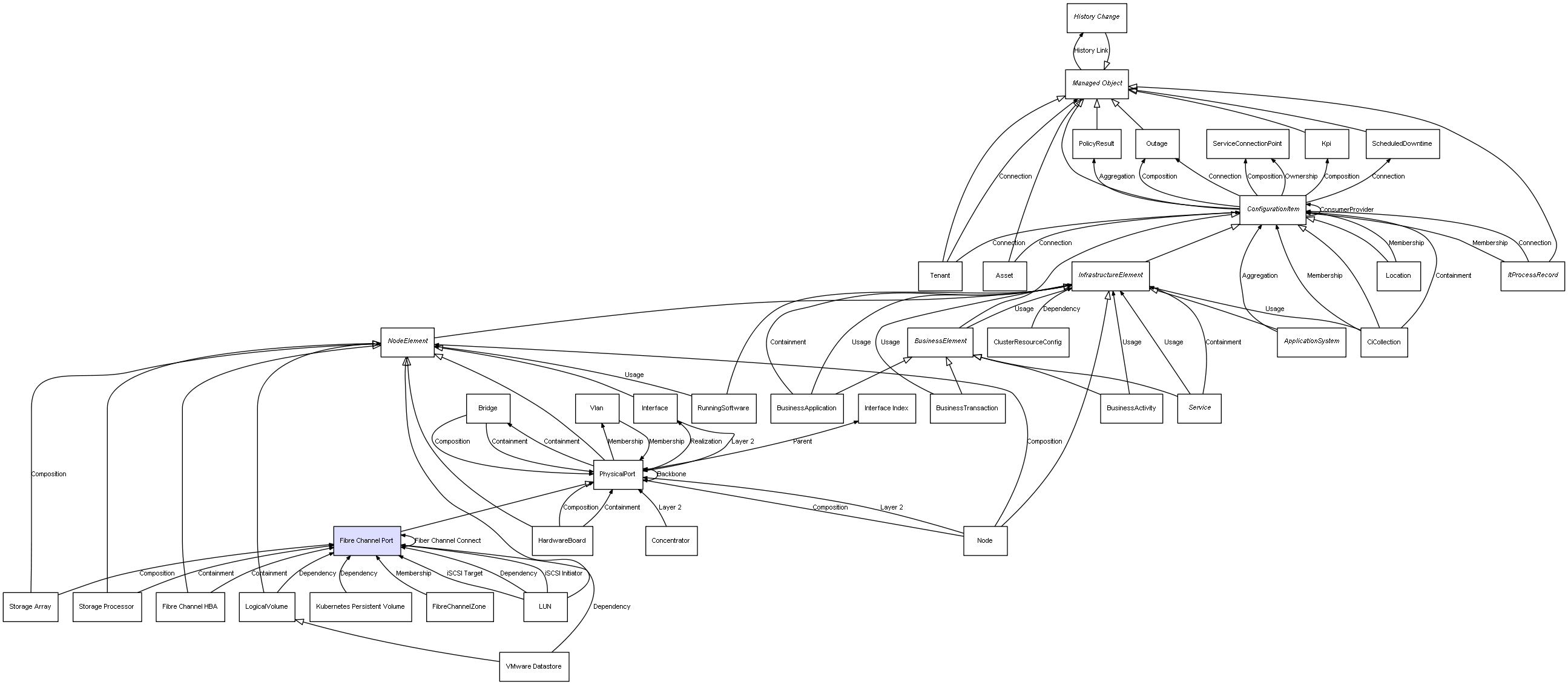 | Node | PhysicalPort | Composition | Represents a relation between 2 objects where one is contained within the other, and the included object can not exist without its container. Therefore, when the container is deleted, all its contained object will be automatically removed |