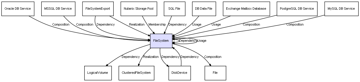 | MSSQL DB Service | FileSystem | Composition | Represents a relation between 2 objects where one is contained within the other, and the included object can not exist without its container. Therefore, when the container is deleted, all its contained object will be automatically removed |