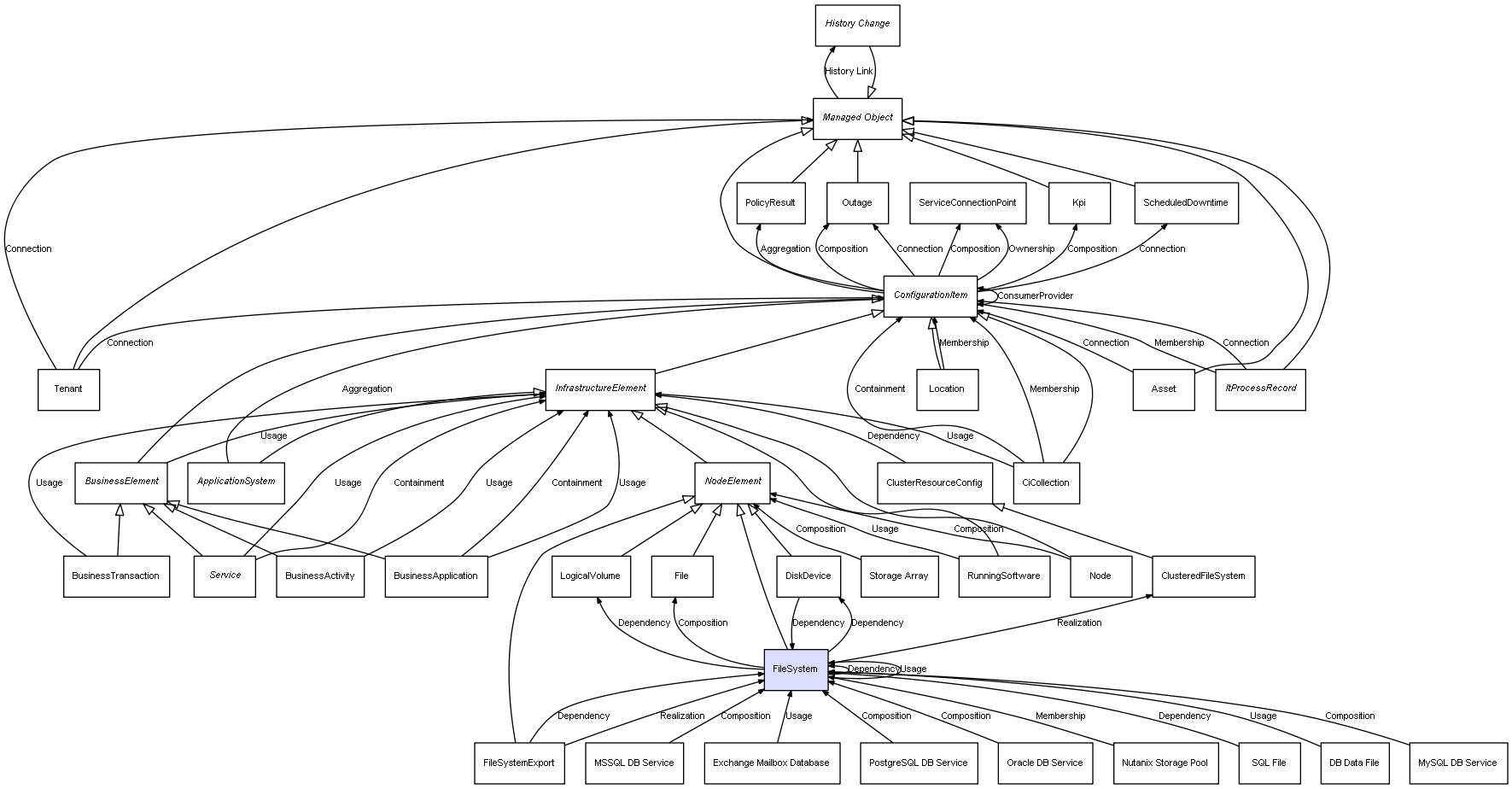 | Oracle DB Service | FileSystem | Composition | Represents a relation between 2 objects where one is contained within the other, and the included object can not exist without its container. Therefore, when the container is deleted, all its contained object will be automatically removed |