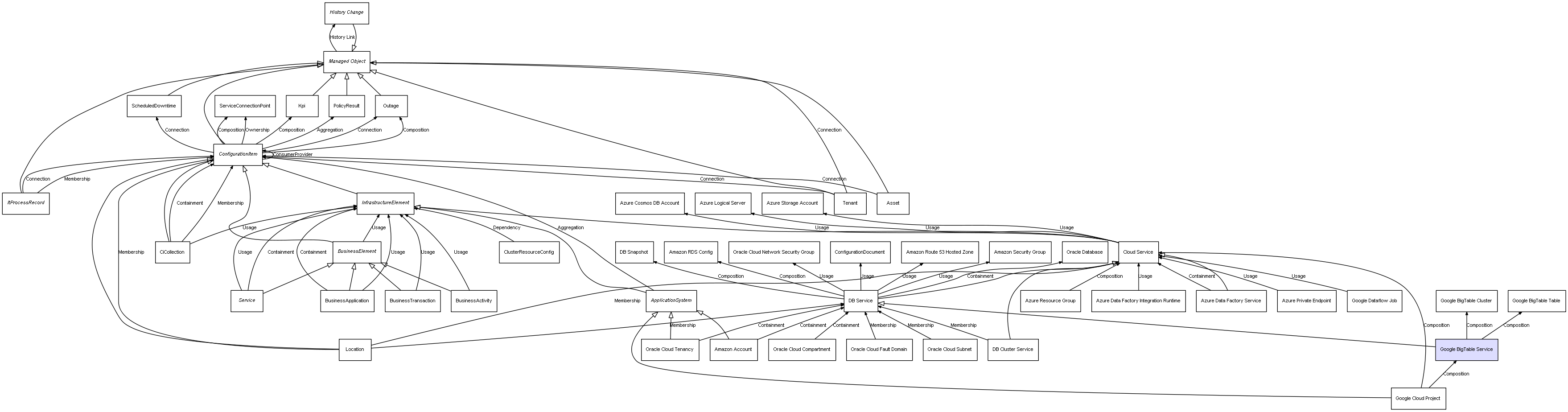 | ConfigurationItem | ServiceConnectionPoint | Composition | Represents a relation between 2 objects where one is contained within the other, and the included object can not exist without its container. Therefore, when the container is deleted, all its contained object will be automatically removed |