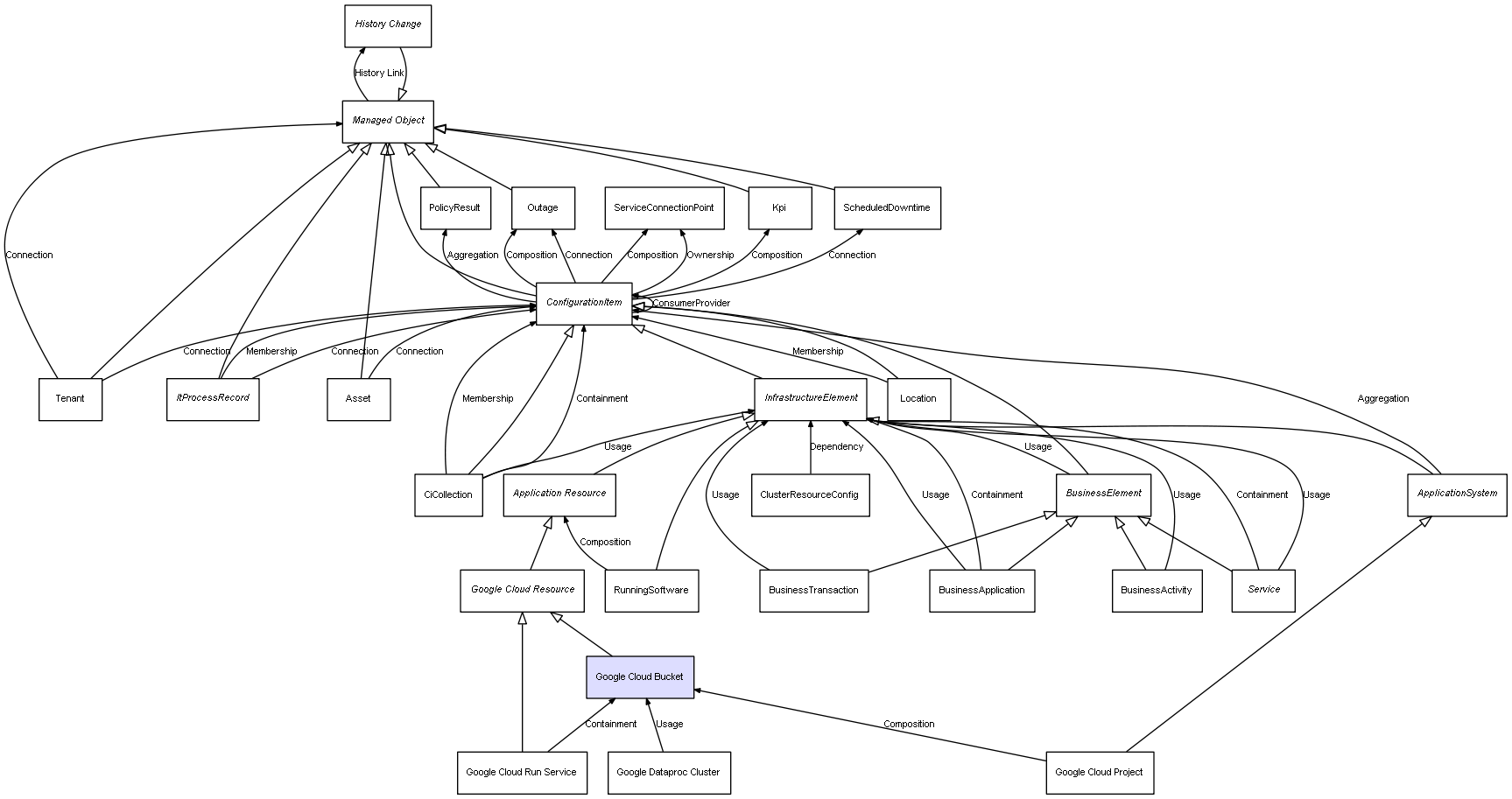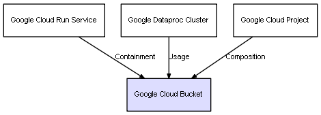 | Google Cloud Project | Google Cloud Bucket | Composition | Represents a relation between 2 objects where one is contained within the other, and the included object can not exist without its container. Therefore, when the container is deleted, all its contained object will be automatically removed |
