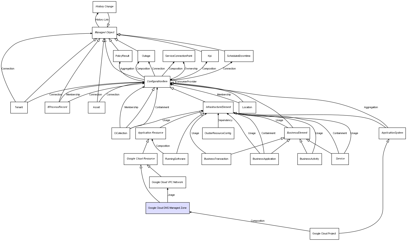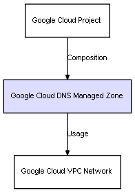 | Google Cloud Project | Google Cloud DNS Managed Zone | Composition | Represents a relation between 2 objects where one is contained within the other, and the included object can not exist without its container. Therefore, when the container is deleted, all its contained object will be automatically removed |