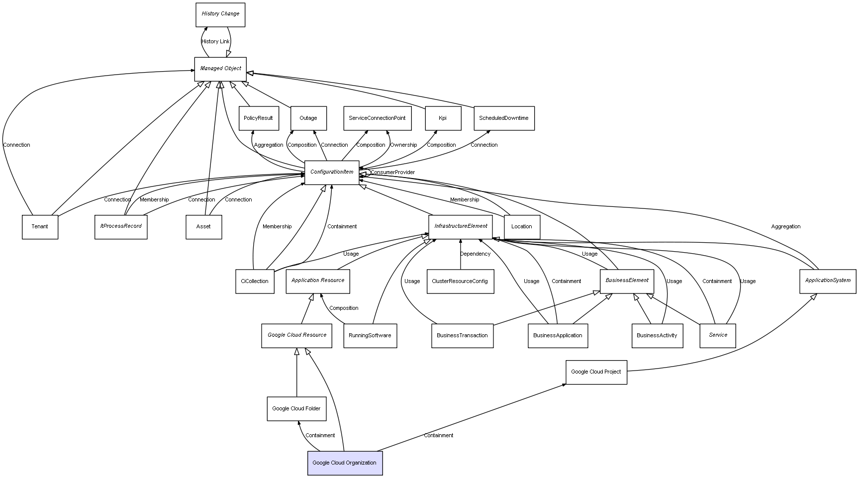 | ConfigurationItem | Outage | Composition | Represents a relation between 2 objects where one is contained within the other, and the included object can not exist without its container. Therefore, when the container is deleted, all its contained object will be automatically removed |